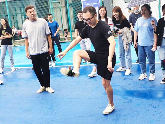 這是為女生們準備的個人賽,同理,男生也可以挑戰。參加者每人一次機會,踢毽子在不間斷、不落地的前提下,個數*多者勝利。并且冠*可以直接去選一個獎品拿走。