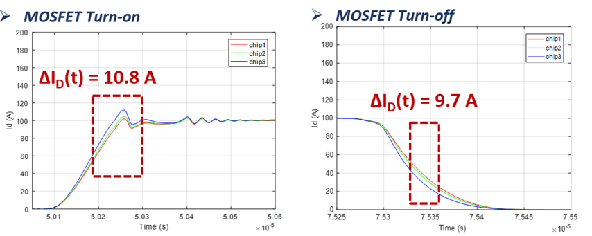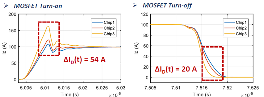 碳化硅SiC電控系統的開發難點主要在于SiC模塊的本體設計及高速開關帶來的系統EMC問題應對。臻驅科技開發的這臺電機控制器采用了日本羅姆ROHM最新發布的第四代碳化硅SiC芯片。相較于傳統的IGBT器件,SiC器件在實際多芯片并聯應用時會出現許多本體設計挑戰,如多芯片間的電流不均衡會導致進一步的熱不均限制芯片的滿額使用(如圖1改善前與改善后的對比),芯片結電容與回路漏感構成的LC諧振,同時高的di/dt在回路漏感上產生較大的電壓過沖限制了模塊的輸出能力等,綜合來看重點在于多維度設計考慮,避免單一因素的短板效應制約SiC在輸出能力、效率等方面的優勢。同時還需考慮工藝及成本選擇適合現有系統的封裝方案,而不是一味地引入新的材料和工藝技術。